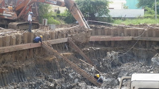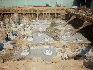 | Tiếp tục đào và đập đầu cọc(đội thi công đập đầu cọc phải đợi gần 10 ngày) |