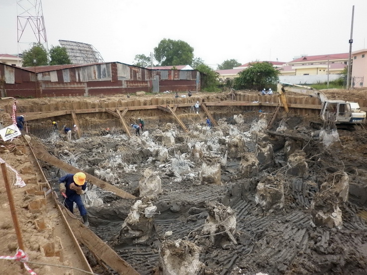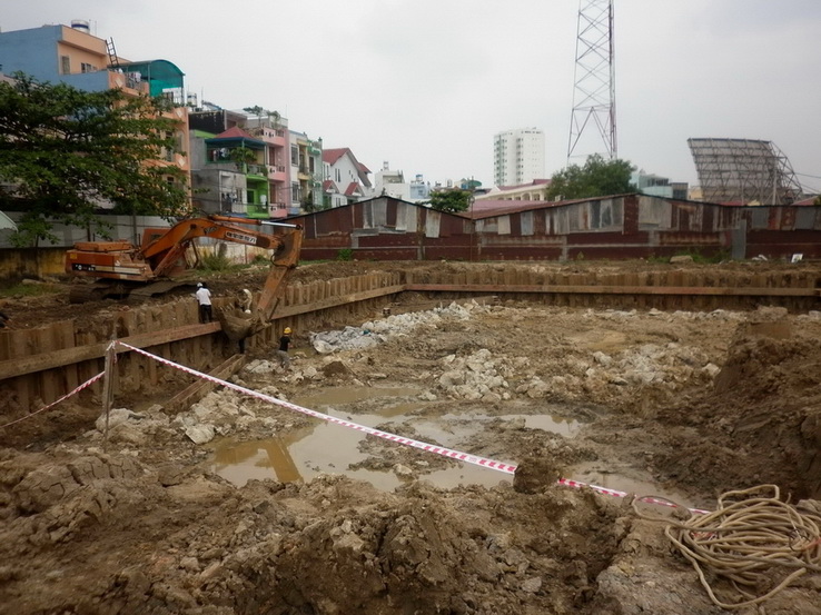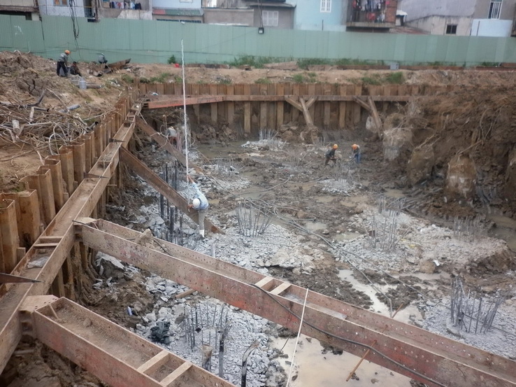 | Tiếp tục đào và đập đầu cọc(đội thi công đập đầu cọc phải đợi gần 10 ngày) |