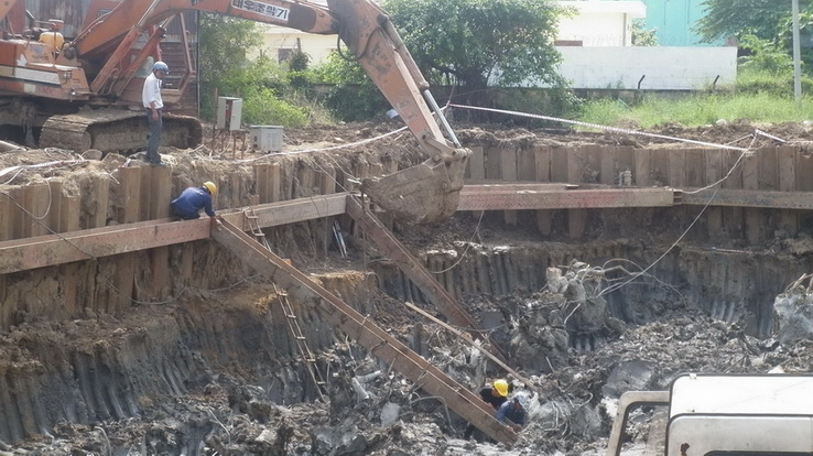 | Đào đất một lần tới cao độ móng và thi công hệ chống xiên và dầm vây cùng lúc.Cắt thép chủ cọc |